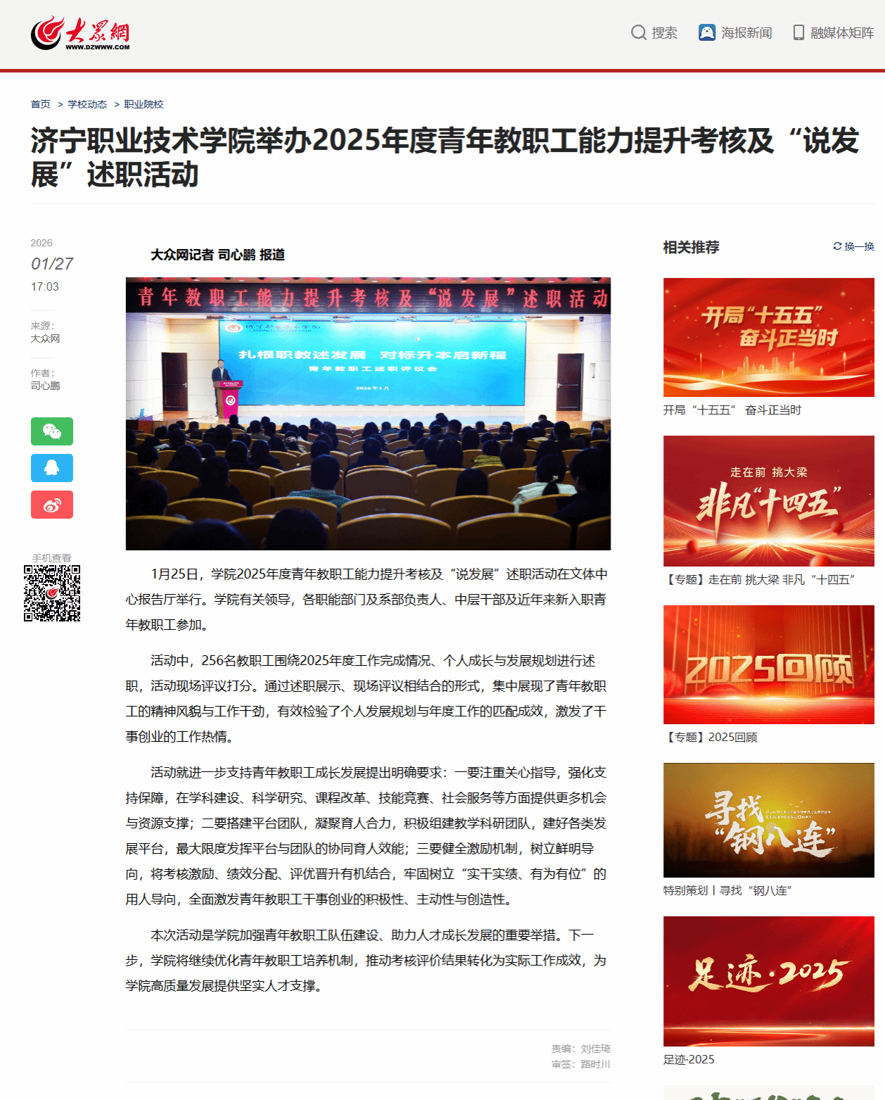 大眾網(wǎng) | 濟寧職業(yè)技術學院舉辦2025年度青年教職工能力提升考核及“說發(fā)展”述職活動
