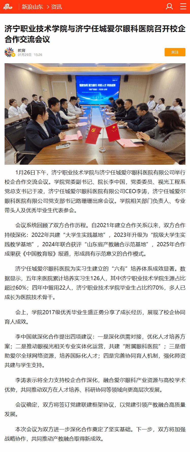 新浪山東 | 濟(jì)寧職業(yè)技術(shù)學(xué)院與濟(jì)寧任城愛爾眼科醫(yī)院召開校企合作交流會議