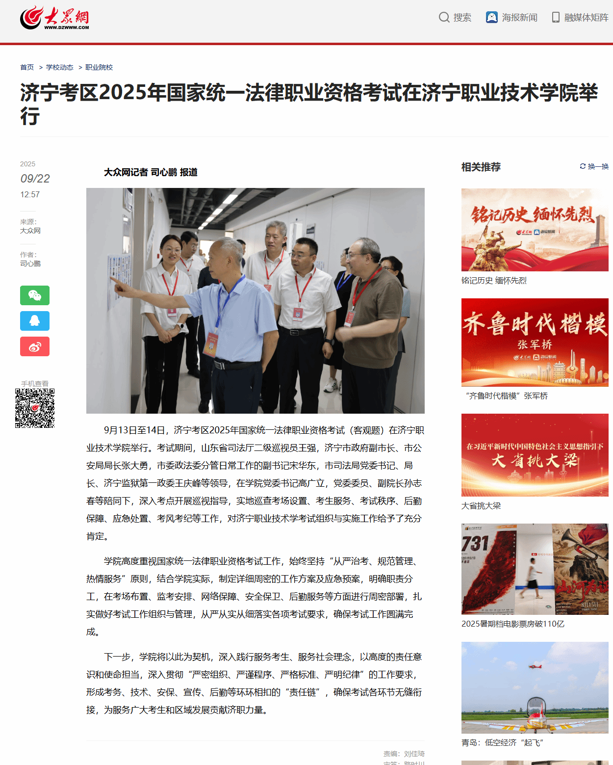 大眾網(wǎng) | 濟(jì)寧考區(qū)2025年國(guó)家統(tǒng)一法律職業(yè)資格考試在濟(jì)寧職業(yè)技術(shù)學(xué)院舉行