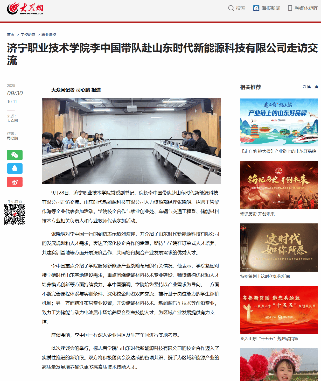 大眾網(wǎng) | 濟(jì)寧職業(yè)技術(shù)學(xué)院李中國帶隊(duì)赴山東時(shí)代新能源科技有限公司走訪交流